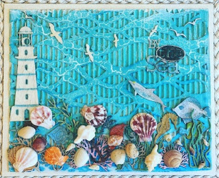 In the mean time I took a piece of cardboard and used a scalpel to cut shapes out of the top layer of the cardboard to create the background to make it look a bit like waves, I then covered the cardboard with white Dylusions ink and once dry I mixed some acrylic blue paint and water and sprayed that over the dried ink, I was happy with the results as it turned out like a crazed look...